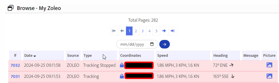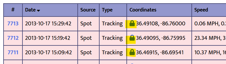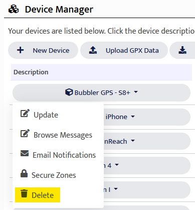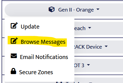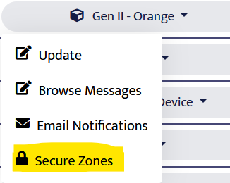 There are two ways to manage secure zones. First, from the Device Manager. Find your device and click its name. Choose Secure Zones from the menu. Second, from the device's Message Browser you can click the lock icon next to any message's coordinates. The secure zones page will appear and the coordinates you clicked on will prepopulate the form.