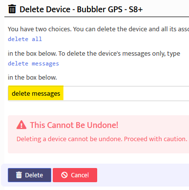 A user may want to purge the messages from a device or purge a device from SpotWalla in order to reduce the cost of using SpotWalla. We don't encourage removing data unless you are absolutely sure it's the right thing to do. These actions are permanent.
