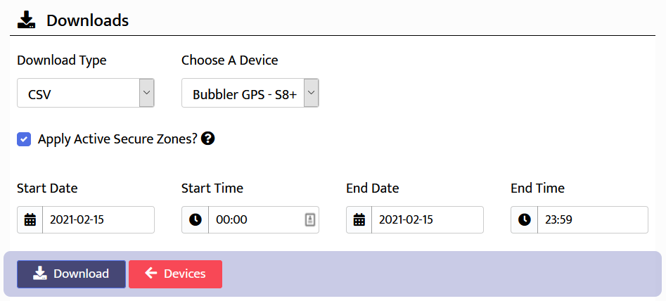 You can download your device data in three formats - CSV, KML and GPX. From the Device Manager click the