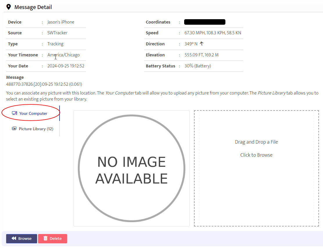 Either way, you'll wind up on the Message Detail screen. The screen below shows a location that does not have a picture associated with it yet: