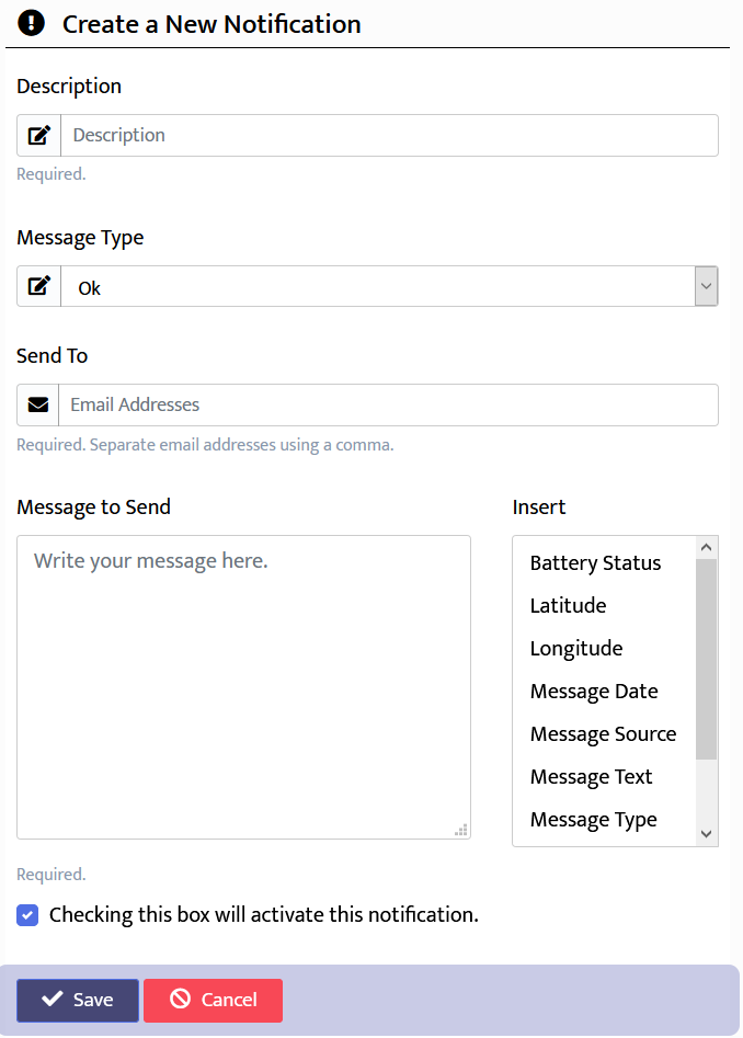 Enter a description and choose the message type. The list of message types is tailored to the type of device. So if it's a SPOT device, you'll see Ok, Help and Custom message types.
