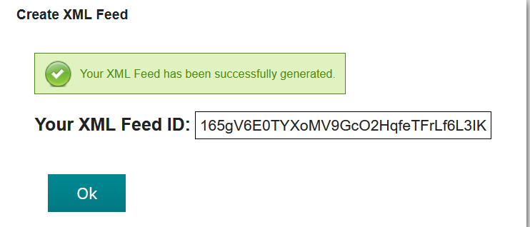 Copy the XML Feed ID from the dialog. If you set a feed password, take note of it. When setting up your device in SpotWalla enter these values for the XML Feed ID and Feed Password attributes.