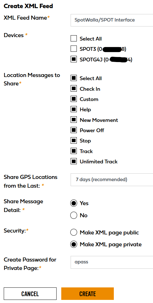 If you have multiple SPOT devices, you'll need to create an XML Feed for each one you want to use with SpotWalla. So in the Devices list, only choose the one you're setting up now.
