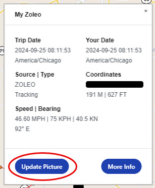 While viewing a trip, locate the location and click its icon. In the popup window click the Update Picture link: