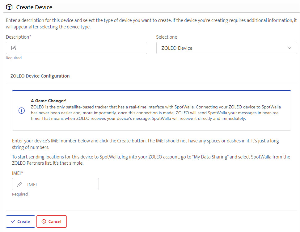 Log into SpotWalla, go to the Device Manager and create your ZOLEO device. You should see a page that looks like: