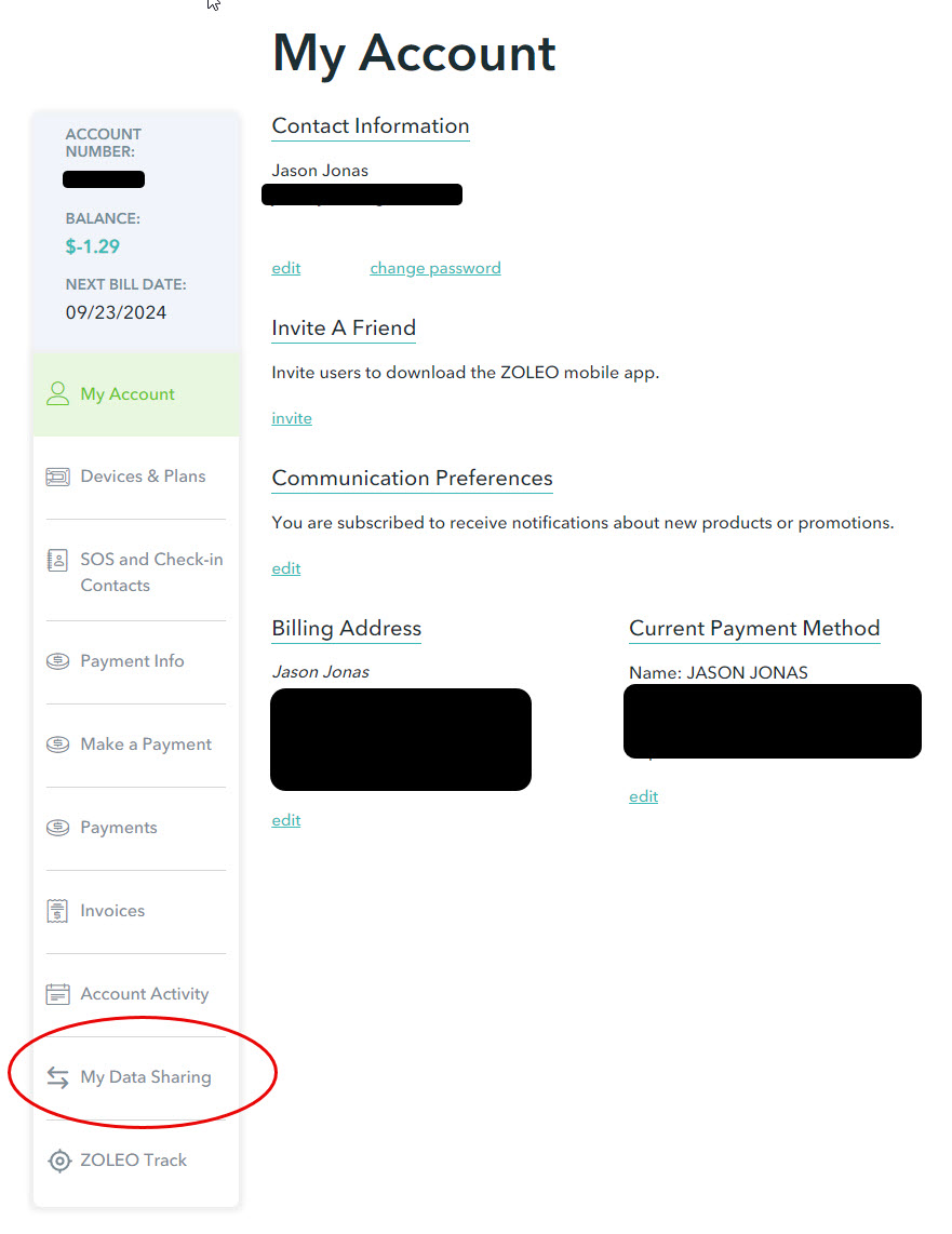 Click the the "My Data Sharing" link in the left-hand column. The next screen will display the ZOLEO Partner's list.