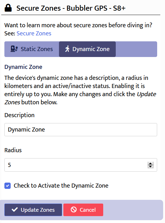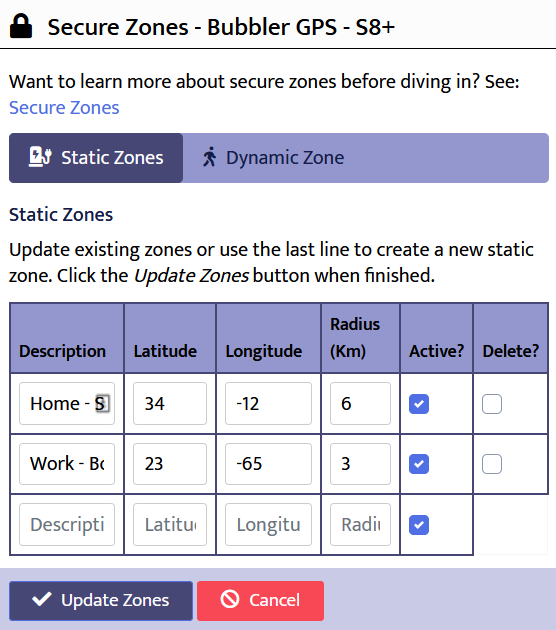 A device's dynamic zone cannot be deleted. You can update its description, radius and active status. By default, the dynamic zone is not active. To enable it, check the box next to Check to Acivate the Dynamic Zone and click the Update Zones button.