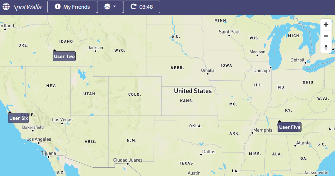 At the top of the view you can click SpotWalla and go back to the home page. If you click My Friends, a dialog will appear with all your friends listed. Click any friend and the map will pan/zoom to their location.