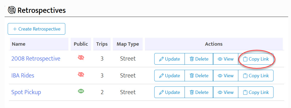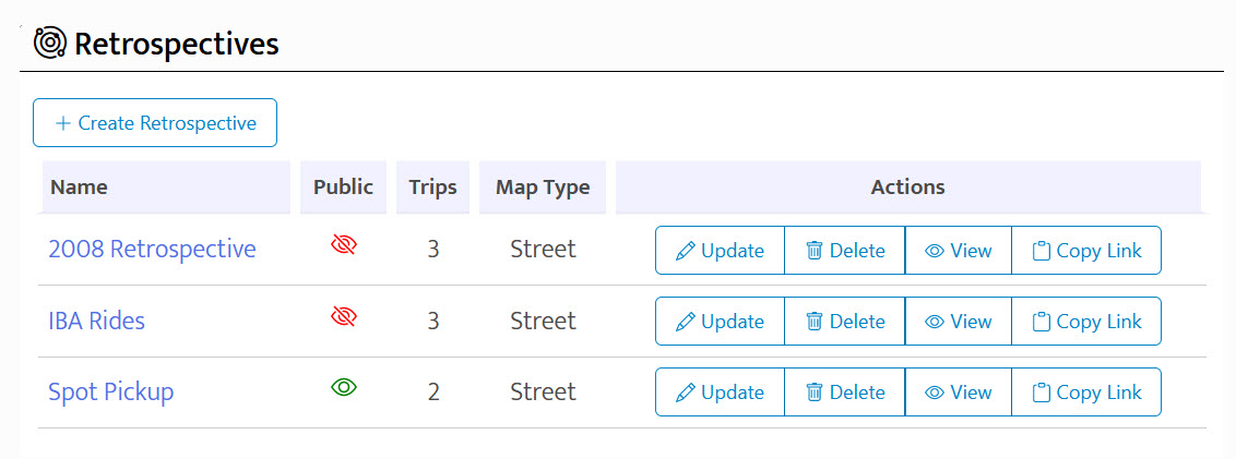 To create a new retrospective, click the Create Retrospective button. If you've created some already, they're listed in a table. In it you'll see the name/description, whether or not the retro is public or private, the number of trips in the retro and the default map type.