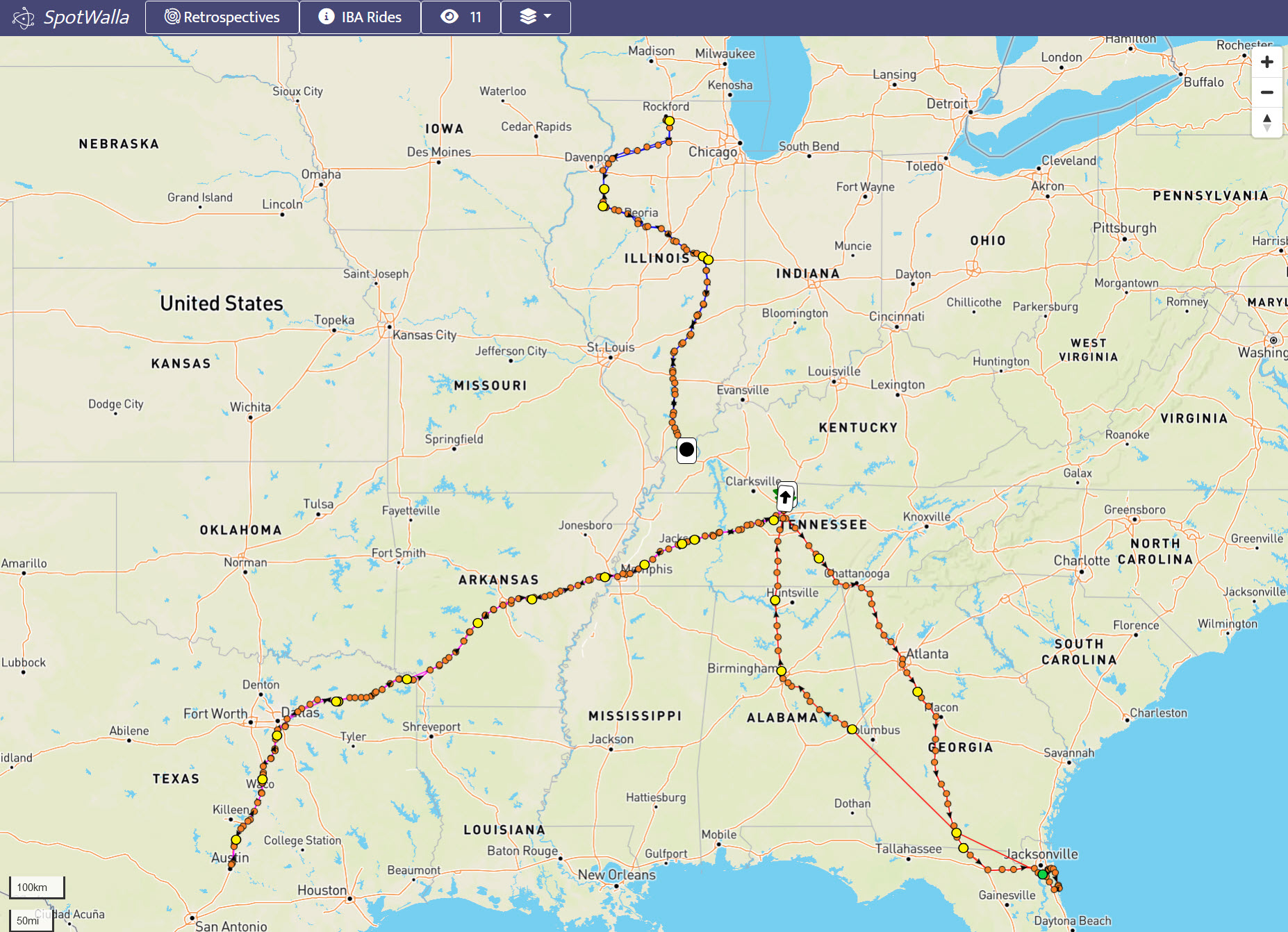 A retrospective is a way to view multiple trips on a single map. For instance, you may want to see all your IBA rides, or hiking trips, or off-road trips on a map. A retrospective is the way to make that happen.