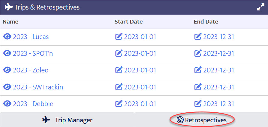 After logging into SpotWalla you can access your retrospectives by finding the Trips & Retrospectives panel and clicking the Retrospectives button.