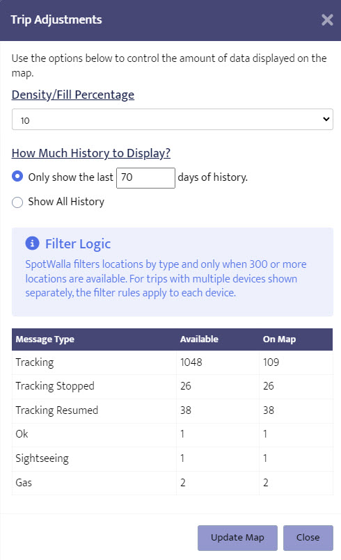 By default SpotWalla will only show the last 7 days of history while your trip is active. You can override the number of days or you can choose to display all history. And using the Density/Fill Percent setting, you can control the number of locations (the density) returned. This can have a huge affect on how the trip looks to the viewer.