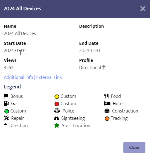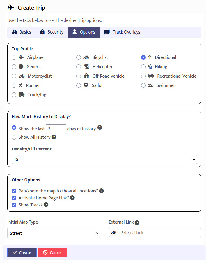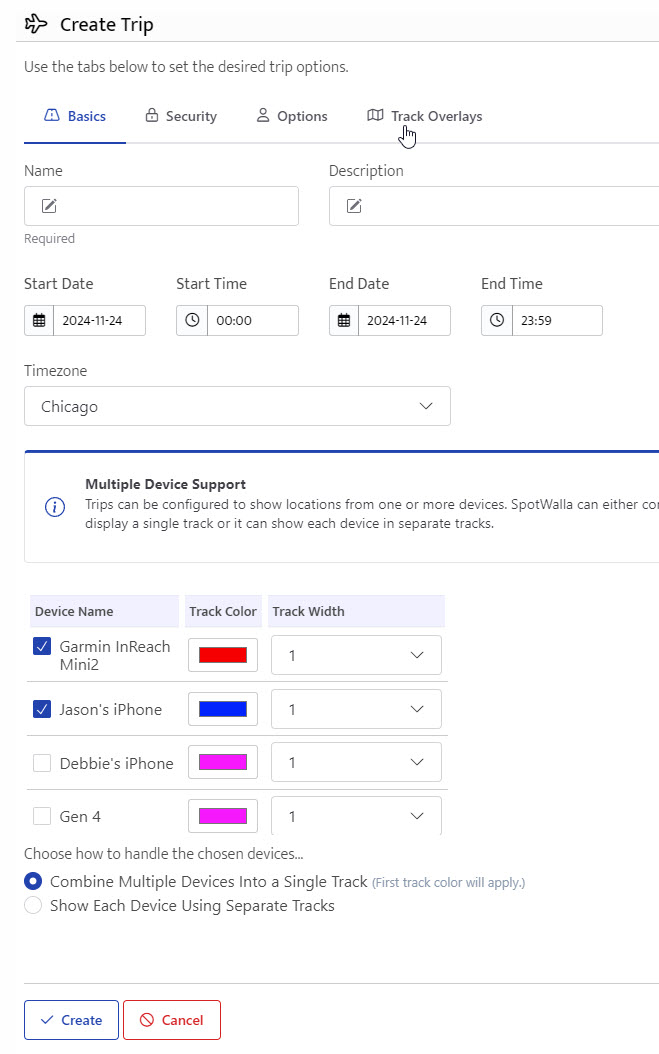 The Basics tab options shown above include the trip name, description and start/end dates. You will also choose one or more devices to display on the map, the color of the default track for the device, the track width and how to display each device on the map.