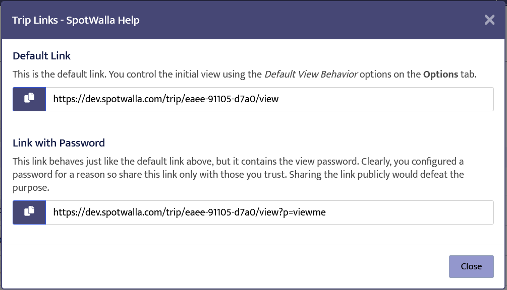 If your trip is password-protected, you will see another link that includes the password. This is a convenience link that can be shared with others. They won't be prompted for the view password. You'll want to be careful when sharing this link. Only send it to people you trust and let them know it shouldn't be shared with others.