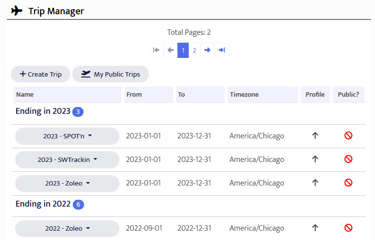 If you want to create a new trip, click the Create Trip button toward the top of the Trip Manager. If you want to share all your public trips with family and friends, click the My Public Trips button. A window will appear with your public trips link. Share with others however you see fit.