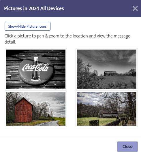 Click the Show/Hide Picture Icons button to toggle the display of the picture icons in the trip viewer. Click any picture to pan/zoom the map to that location and open the message detail popup.